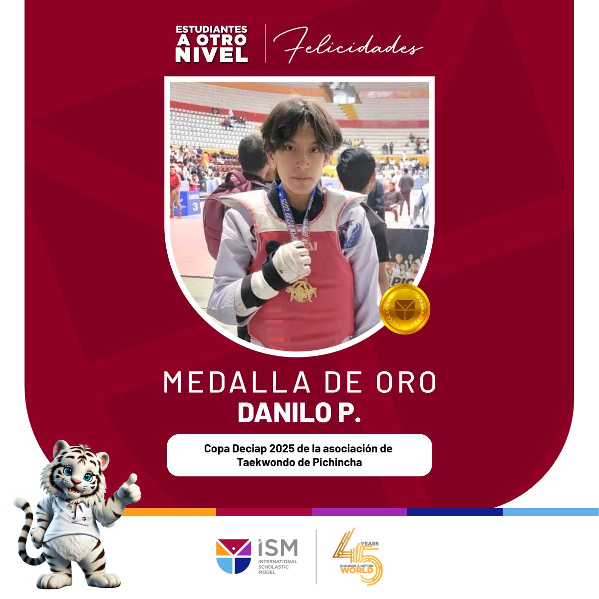 Felicitamos a nuestro estudiante Danilo P. Ganador de la Medalla de Oro en la Copa Deciap 2025 de la asociación de Taekwondo de Pichincha